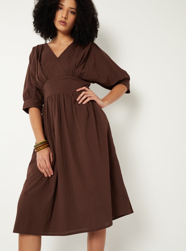 A sophisticated A-line midi dress featuring a premium textured finish and a flattering flared silhouette. Crafted with a graceful mid-calf length, this elegant piece offers a minimalist and polished look suitable for both formal and professional occasions.